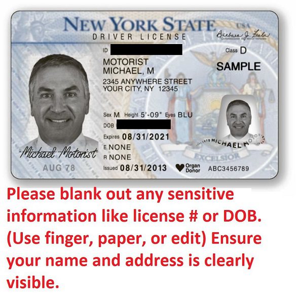 Note: You should not use any software to edit the photos, if there is any information you don’t want us to see you can cover it with your thumb or a piece of paper. We already have your name and address and we need to confirm it with another source.