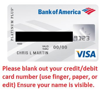 - Take a clear photo of your Credit/Debit Card with your name and the last four digits.